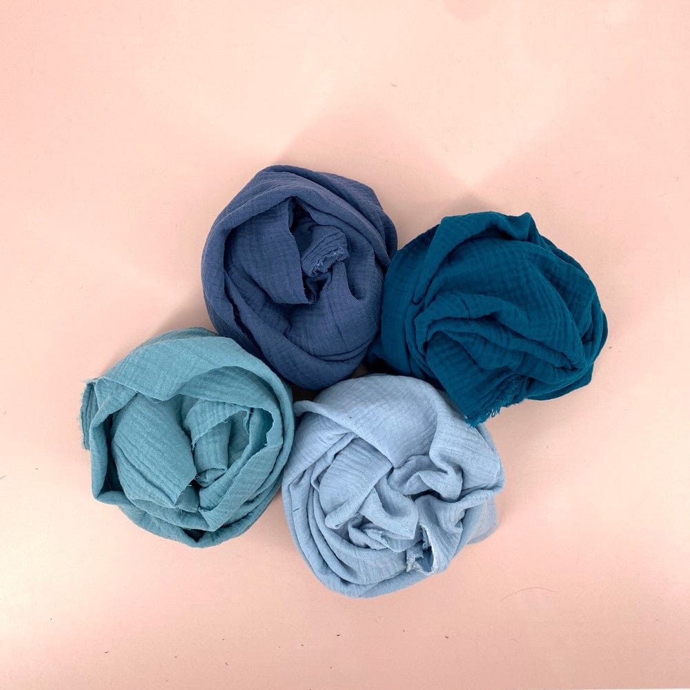 Vores double gauze stof består af to lag af løst vævet bomuldsgaze; også kaldet musselin. De to lag musselin er med lette sting og i et regelmæssigt mønster syet sammen, hvorved tekstilet nu fremstår som ét og ikke længere er så transparent. Den løse vævning og rynkede overflade giver et luftigt og svalende materiale samtidig med at de dobbelte lag giver stoffet en vis tyngde og et godt fald.