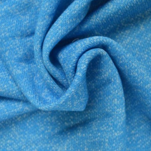 Meleret french terry stof. Dette strikkede stof er blødt og med stræk i længdegående retning. French terry er strikket med små løkker på bagsiden der giver en blød og behagelig følelse mod huden. Metervaren er absorberende, varm og hyggelig og kan f.eks. bruges til let joggingtøj, huer, bukser, t-shirts, pullovers og børnetøj.