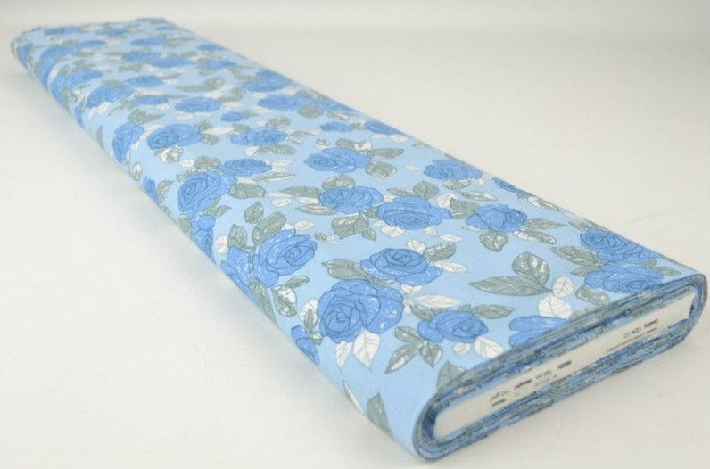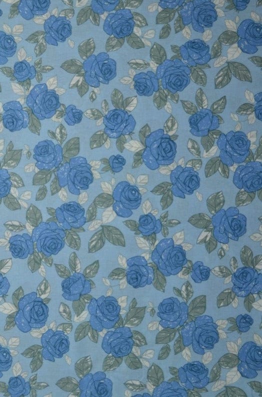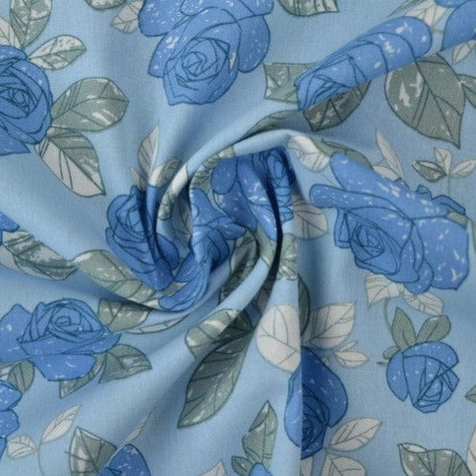 BOMULDSPOPLIN M. SKITSEREDE BLÅ ROSER