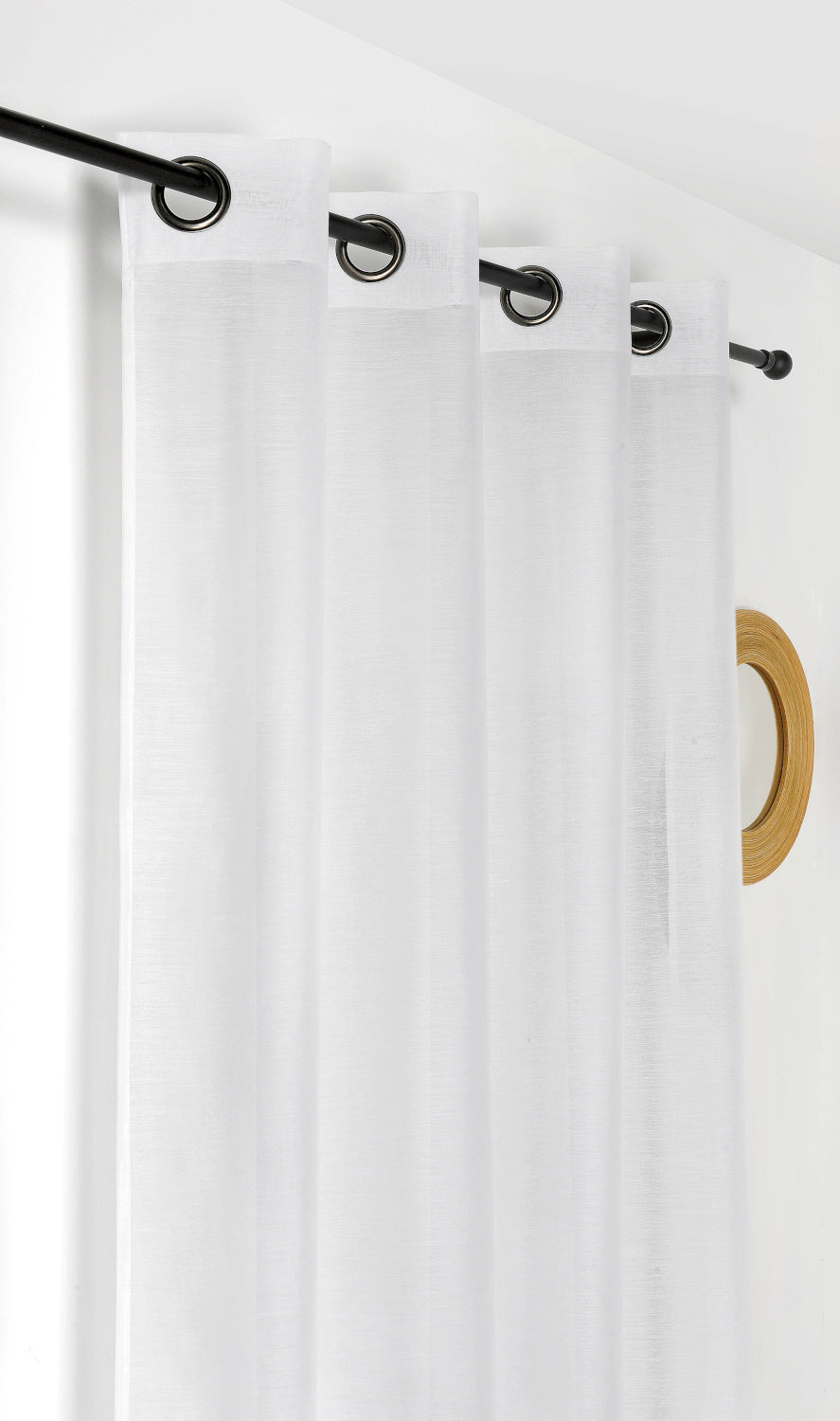 Dette gardinstof er et let, åbentvævet lærredsstof med stift fald der minder om batist i udseende. Stoffets luftige vævning gør det forholdsvist gennemsigtigt og ensartet på begge sider - så det ser flot ud uanset om du ser det fra gaden eller stuen. Stoffet har en glat, let blank overflade, er produceret i Frankrig og er Oeko-tex certificeret.