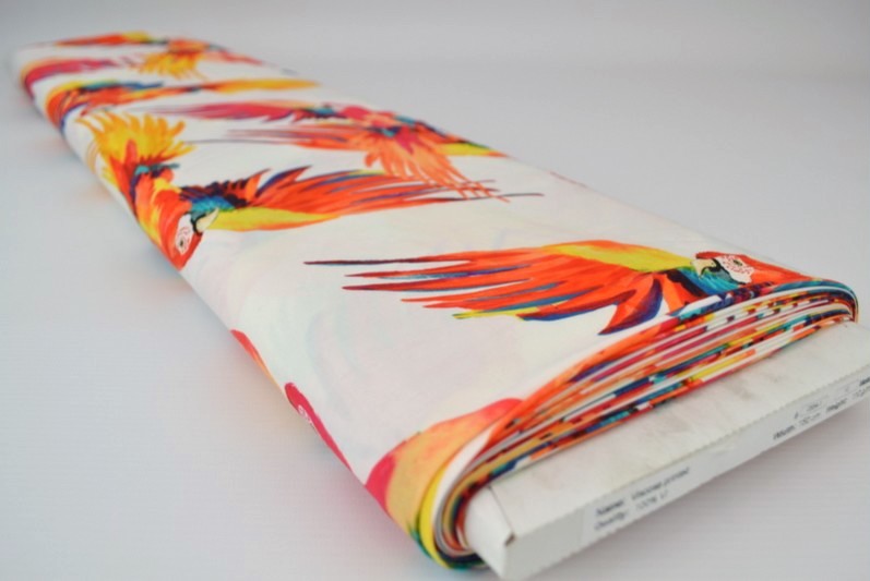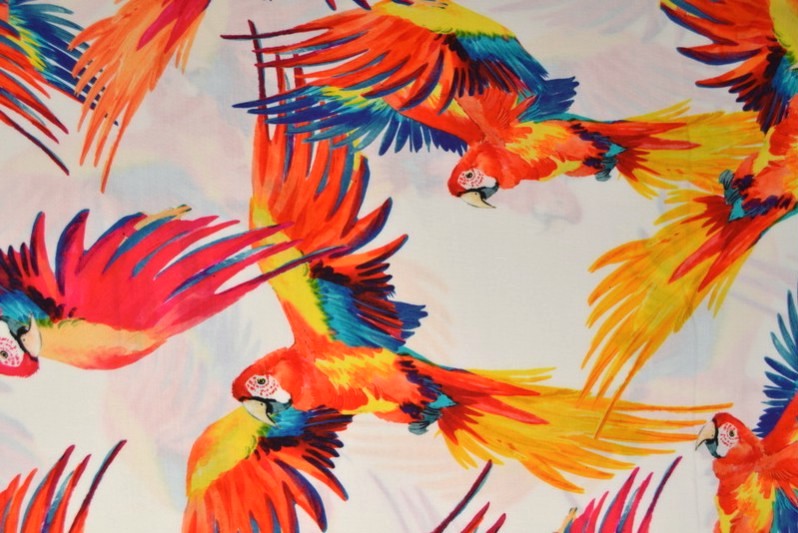 HVIDT VISKOSE STOF MED PAPEGØJER – LET FALD & ELEGANT MAT GLANS