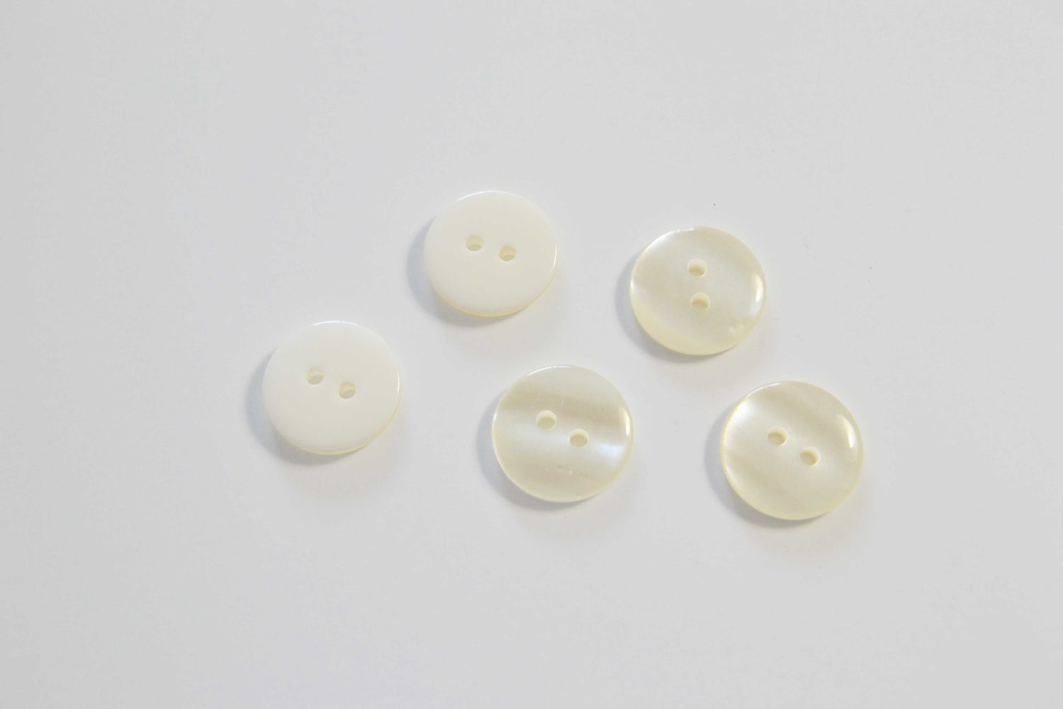 Hvid 2-huls knap. Knapperne er lavet af plastik og har en diameter på ca. 18 mm.