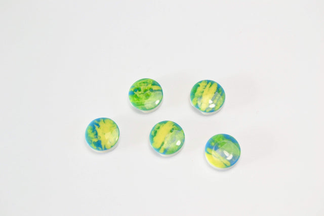 Knapper med mønster i grønne og blå farver. Knapperne er lavet af plastik og har en diameter på ca. 15 mm.