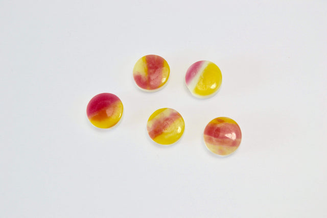 Knapper med mønster i røde og gule farver. Knapperne er lavet af plastik og har en diameter på ca. 15 mm.