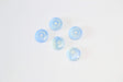 Lyseblå knapper med mønster. Knapperne er lavet af plastik og har en diameter på ca. 10 mm.