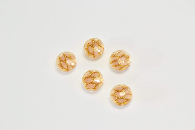 Lyserøde knapper med blomster mønster og guld detaljer. Knapperne er lavet af plastik og har en diameter på ca. 15 mm.