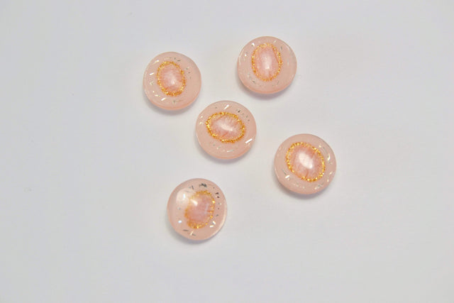 Lyserøde knapper med mønster og guld detalje i midten. Knapperne er lavet af plastik og har en diameter på ca. 15 mm.