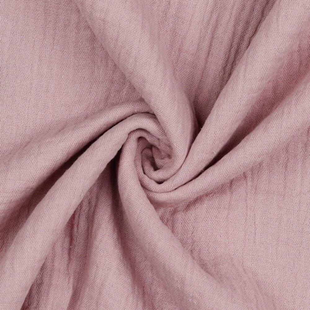 Vårt double gauze-tyg består av två lager glest vävd bomullsgas, även kallad muslin. De två lagren muslin är sammanfogade med lätta stygn i ett regelbundet mönster, vilket gör att tyget upplevs som ett enda lager och mindre transparent.